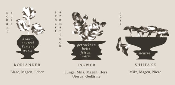 Bei der Ernährungslehre der chinesischen Medizin beeinflussen die verschiedenen Geschmäcker und Temperaturen der einzelnen Nahrungsmittel durch gezielte Zubereitungsarten die Funktionen des